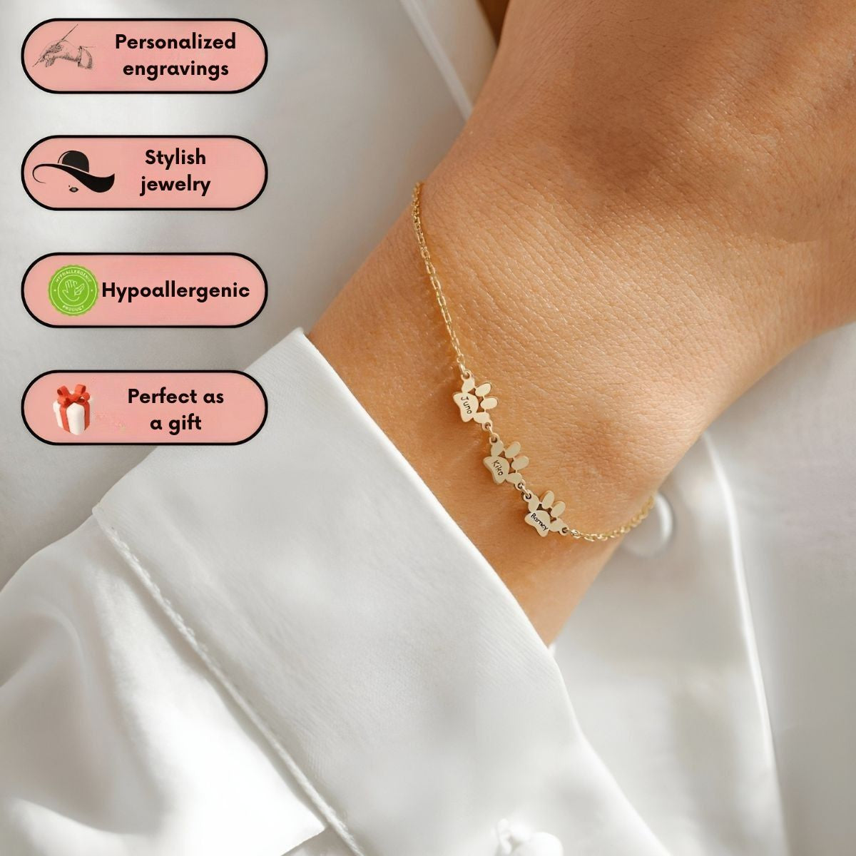 This bracelet is more than just a piece of jewelry — it’s a heartfelt tribute to the pets who leave a mark on your life. The Pawvera™ | Engraved Paw Personalized Bracelet lets you engrave up to 8 names, dates, or words, so you can carry their presence with you wherever you go. Subtle, elegant, and full of meaning, it’s the perfect way to honor your furry companions, past or present, with love.- Material: High-quality stainless steel with a polished, long-lasting finish
